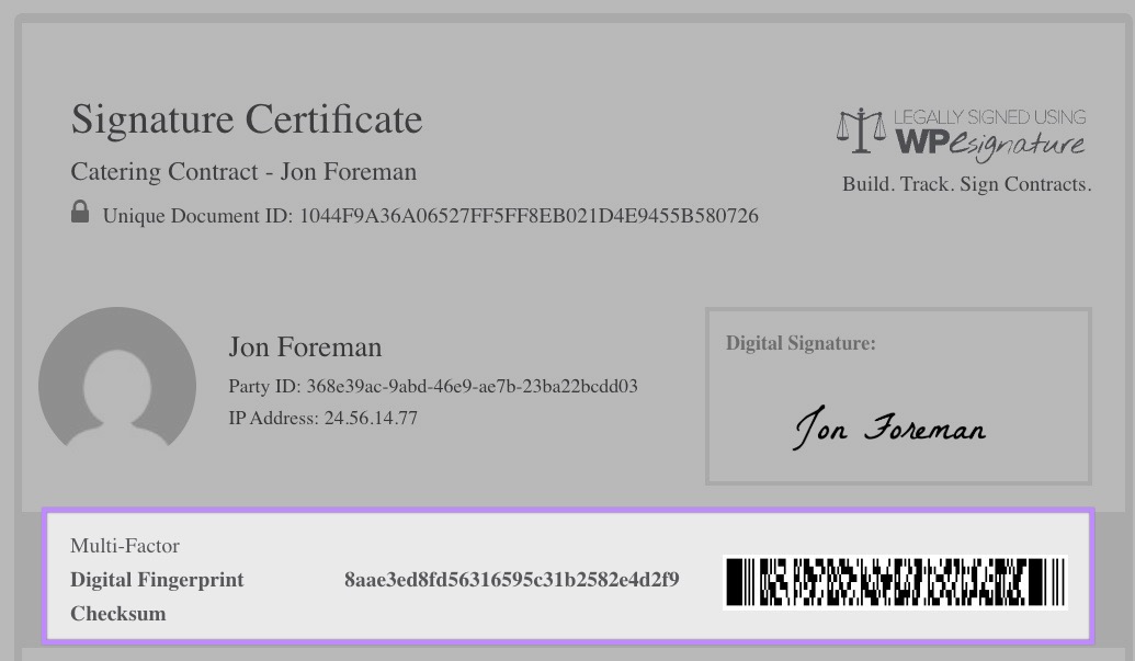 If the multi-factor digital checksum fingerprint that is listed in your document doesn’t match the text and numeric string that is returned when scanning the barcode, then you might have reason to suspect the authenticity of the document. WP E-Signature scanned barcode results should match the same fingerprint checksum that is generated on your document.